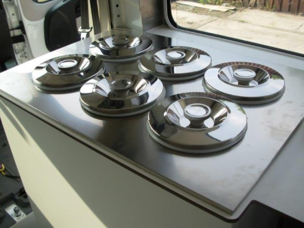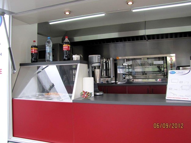 Grundausstattung: Elektro- und Beleuchtungsanlage in LED-Technologie Gasanlage Edelstahl-Einbaumöbel im hinteren Bereich, mit Arbeitsplatte Edelstahl-Einbaumöbel im vorderen Bereich, mit Arbeitsplatte Sanitärbereich mit Kleiderschrank Dunstabzugshaube mit Öl-Kondensator Thermoschutz an den Wänden 3-Becken-Spüle mit Hähnen Lüftungssystem für Kühlschränke Schutzscheiben Optionale Ausstattung: großflächige Werbetafel unabhängiges Energieversorgungssystem