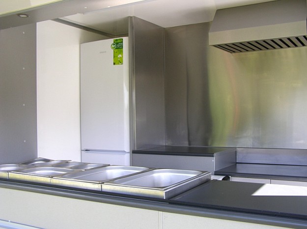Ausstattung: – Sozial- und Sanitärbereich – Container für Gasflasche – Dunstabzugshaube mit Öl-Kondensator in Edelstahl-Ausführung – Kühlschrank AGD – Einbaumöbel im vorderen Bereich mit Platz für elektrische Bain-Maries – holzähnliche Ablage vorne, offen – Ablage über dem Verkaufsfenster, LED-beleuchtet – Pastakocher – Gasheizer.