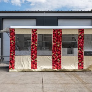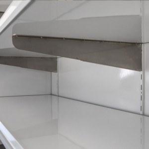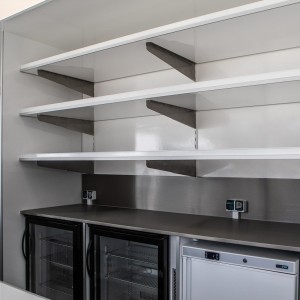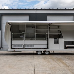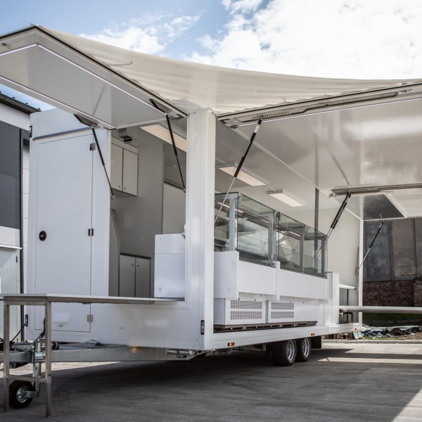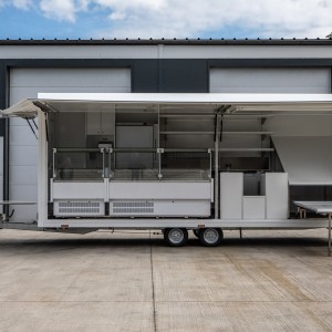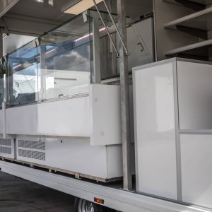 Der Anhänger ist innen 6m lang. Es hat 2 Kühltheken, die sanft nach vorne gleiten. Außerdem ist es hinten mit 4 Kühlschränken und einem Edelstahlaufsatz ausgestattet. Es hat auch einen versenkbaren Tisch und einen schrägen Tisch zum Ausstellen von Produkten.