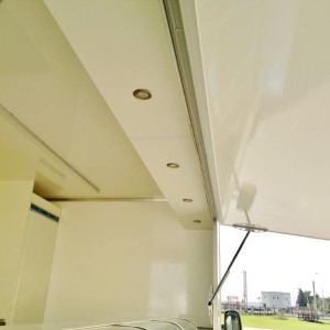- holzähnliche Einbaumöbel im vorderen Bereich, offen, mit Arbeitsplatte – weiß